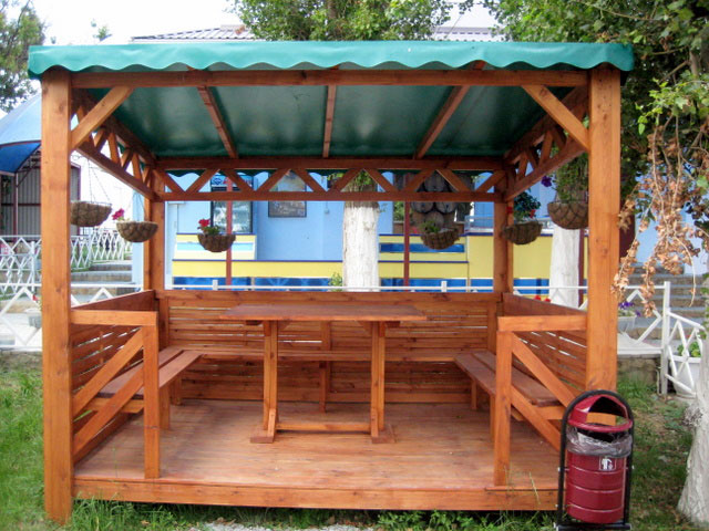 Наиболее часто применяемое для постройки беседок дерево – это сосна, ель, дуб или лиственница. Для увеличения срока службы, все детали из древесины нужно обрабатывать специальной водоотталкивающей пропиткой, которую желательно применять через каждые 6- 12 лет.
