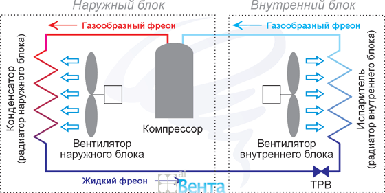 Принцип обогрева своих квартир можно рассмотреть, например, на примере последних моделей кондиционеров. Кондиционеры представляют собой два блока. Один – внутренний, а другой наружный. Данные блоки соединяются между собой трубками, что позволяет размещать их на довольно прилично расстоянии друг от друга. Во внешнем блоке расположился компрессор и теплообменник, а во втором находится еще один теплообменник и один теплорасширительный вентиль. Воздух двигается по теплообменникам, который направляется в них вентиляторами, а между блоками в трубках, которые их соединяют, циркулирует хладагент или просто фреон.