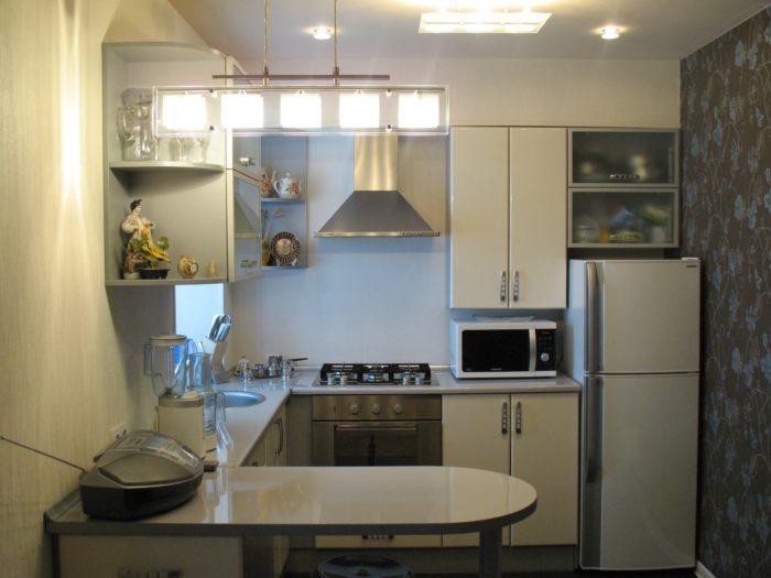 Стол в маленькой кухне должен быть овальным или круглым и небольшого размера, лучше барная стойка, как писалось выше.
