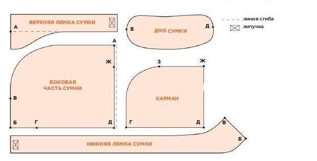 Схема пошива сумки переноски собакИтак, собрав все, можем приступать к пошиву сумки. Для этого, берем все наши листы ткани, паралон, вырезаем из них детали сумки: верхнюю лямку, дно, боковую часть, карманы, нижнюю линию, оставляя запасы для изгибов согласно данного рисунка.