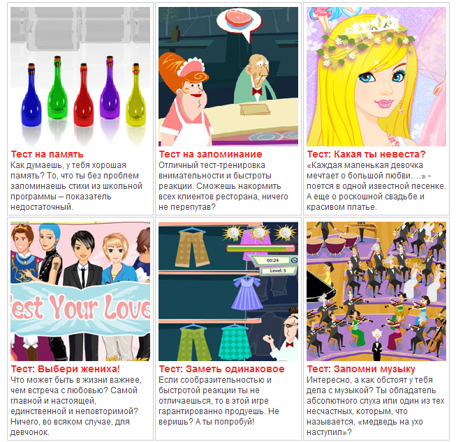 Так же очень популярными стали игры-тесты. В них могут играть как дети, так и взрослые. Девочкам, проходя простые тесты для девочек можно узнать много нового и интересного о себе, о своих наклонностях и вкусах. Игры тесты бывают разные. Одни их них направлены на тренировку памяти. Сюда входит запоминание цветов, одежды, музыки, картинок и так далее. А другие тесты созданы для того, чтобы узнать что-то новое. Это игры, «Какая ты принцесса», «Какая твоя планета», «Узнай свой спорт» и еще великое множество разнообразных тестов. Вы можете узнать, каким должен быть ваш идеальный парень, какой цвет вам наиболее подходит, какое платье одеть на вечеринку или на кого из героев мультфильмов вы похожи. Для того, чтобы пройти тест необходимо только правильно ответить на все вопросы. Тесты очень простые и интересные. Некоторые тесты показывают отдельные черты характера, а некоторые и полностью психологический портрет. Они могут рассказать о тебе все, стоит лишь захотеть.